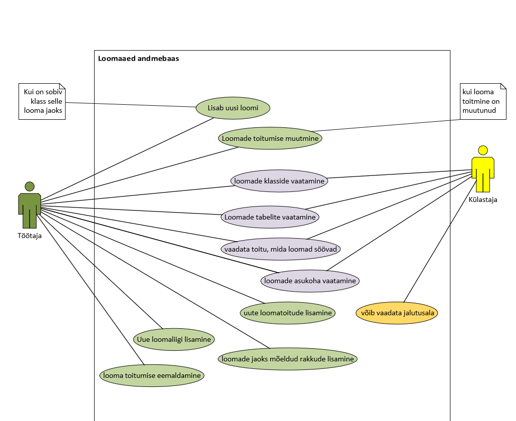 Diagramm näitab, kuidas töötaja haldab loomaaia andmebaasi ja kuidas külastaja saab süsteemist loomade kohta infot vaadata.