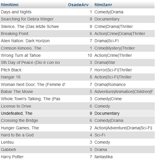 Millised õigused peaks kasutajal olema loodud tabeli suhtes (maksimaalselt 2 õigust tabeli tasandil)? — select ja insert (filmiNimi, OsadeArv, filmižanr)