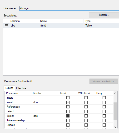 grant insert on filmid (filmiNimi, OsadeArv, filmižanr) to Manager