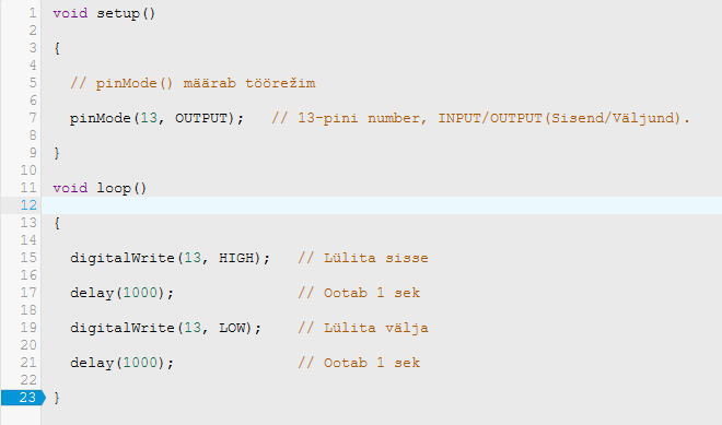 pinMode(RED, OUTPUT) – saab kaks väärtust, mille edastame talle sulgudes kohe pärast funktsiooni nime. Esimene on number-pordi number, teine on sõna
