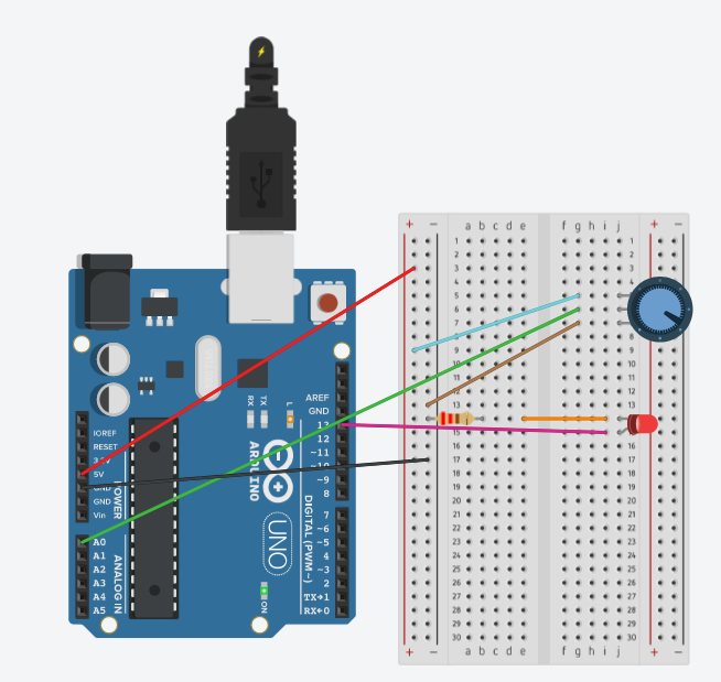 Potentsiomeeter määrab LED-i vilkumise. Kõik sõltub sellest, kui palju potentsiomeeter näitab.