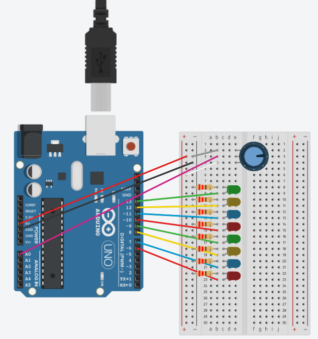 int ledPins[] = {13, 12, 11, 10, 9, 8, 7, 6};